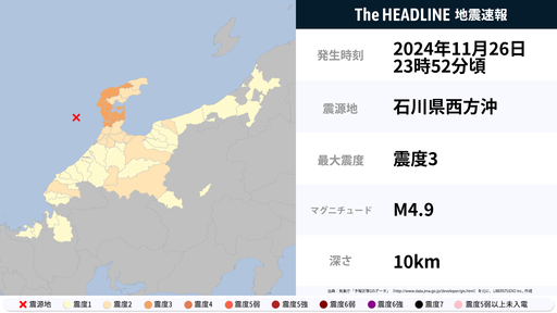 11月26日23時52分頃、石川県で最大震度3の地震を観測