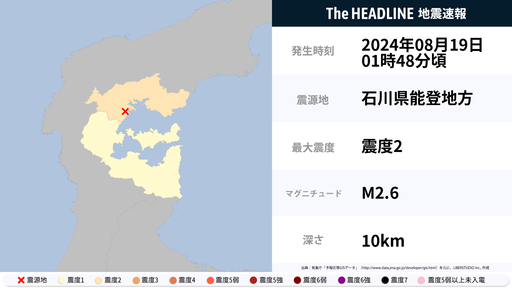 8月19日1時48分頃、石川県で最大震度2の地震を観測