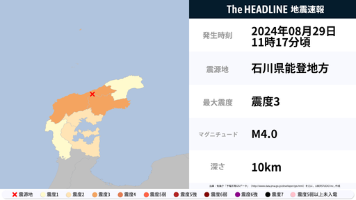 8月29日11時17分頃、石川県で最大震度3の地震を観測