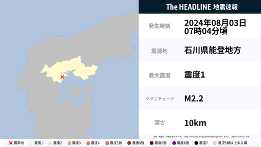 8月3日7時4分頃、石川県で最大震度1の地震を観測
