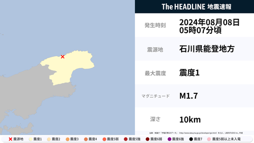8月8日5時7分頃、石川県で最大震度1の地震を観測