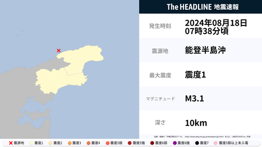 8月18日7時38分頃、石川県で最大震度1の地震を観測