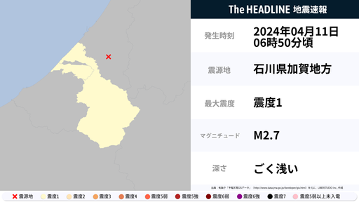4月11日6時50分頃、石川県で最大震度1の地震を観測