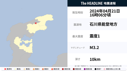 4月21日16時6分頃、石川県で最大震度1の地震を観測