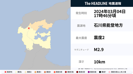 3月4日3時51分頃、石川県で最大震度2の地震を観測