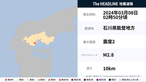 3月8日2時50分頃、石川県で最大震度2の地震を観測