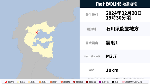 2月20日15時30分頃、石川県で最大震度1の地震を観測