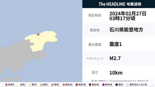 2月27日3時17分頃、石川県で最大震度1の地震を観測