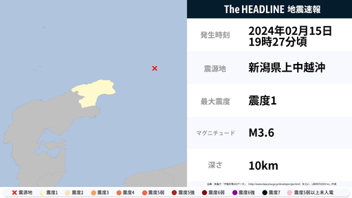 2月15日20時0分頃、新潟県・石川県で最大震度2の地震を観測