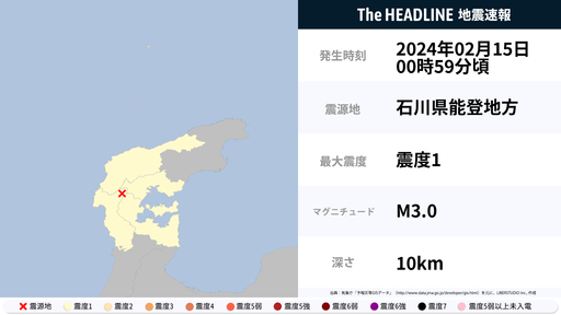 2月15日0時59分頃、石川県で最大震度1の地震を観測