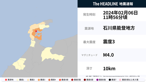 2月6日11時56分頃、石川県で最大震度3の地震を観測