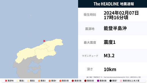 2月7日0時17分頃、石川県で最大震度1の地震を観測