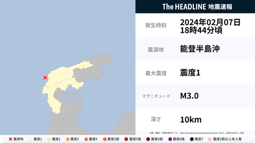 2月7日18時45分頃、石川県で最大震度1の地震を観測