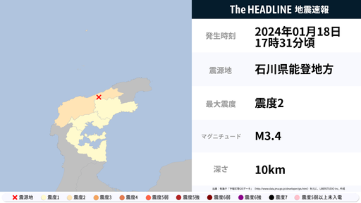 1月18日17時31分頃、石川県で最大震度2の地震を観測