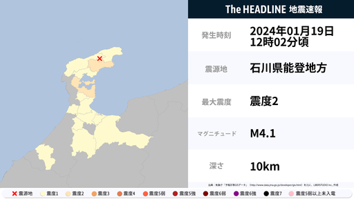1月19日12時2分頃、石川県で最大震度2の地震を観測
