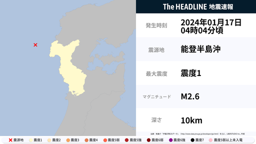 1月17日4時4分頃、石川県で最大震度1の地震を観測