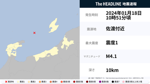 1月18日10時51分頃、新潟県・石川県で最大震度1の地震を観測