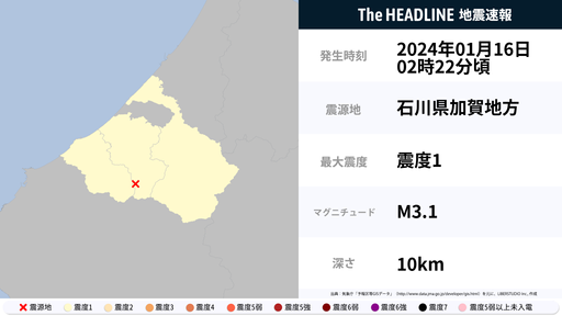 1月16日2時22分頃、石川県で最大震度1の地震を観測