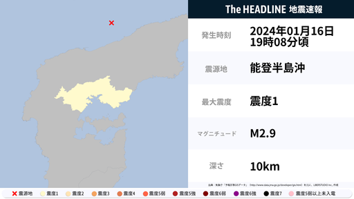 1月16日0時19分頃、石川県で最大震度1の地震を観測