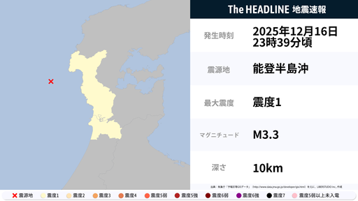 12月16日23時39分頃、石川県で最大震度1の地震を観測