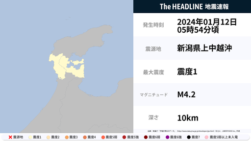 1月12日5時54分頃、石川県で最大震度1の地震を観測