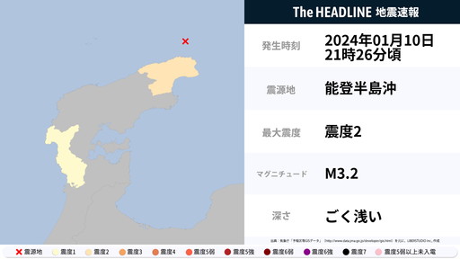 1月10日21時26分頃、石川県で最大震度2の地震を観測