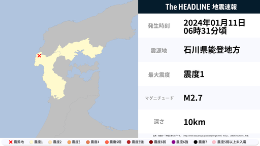 1月11日6時31分頃、石川県で最大震度1の地震を観測