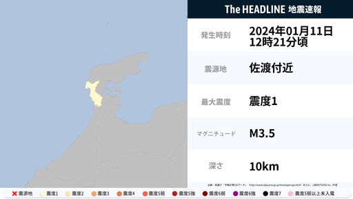 1月11日4時32分頃、新潟県・石川県で最大震度1の地震を観測