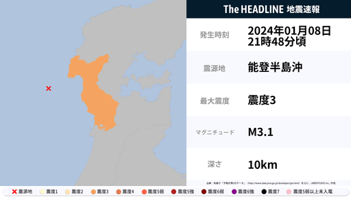 1月8日21時48分頃、石川県で最大震度3の地震を観測