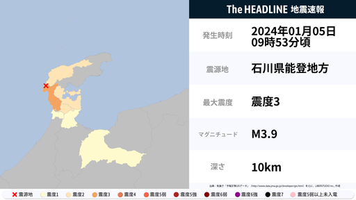 1月5日9時53分頃、石川県で最大震度3の地震を観測