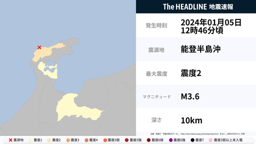 1月5日12時46分頃、石川県で最大震度2の地震を観測