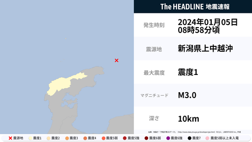 1月5日8時58分頃、石川県で最大震度1の地震を観測