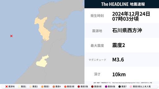 12月24日7時3分頃、石川県で最大震度2の地震を観測