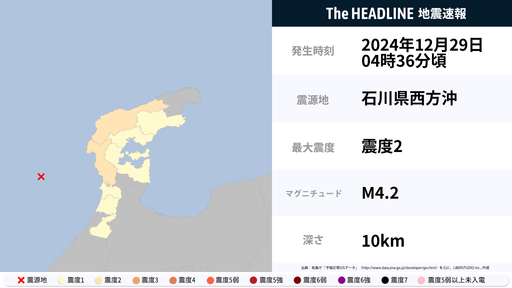 12月29日4時36分頃、石川県で最大震度2の地震を観測