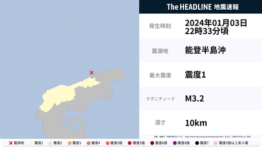 1月3日22時33分頃、石川県で最大震度1の地震を観測