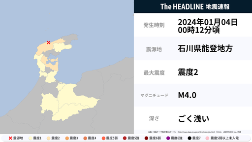 1月4日0時12分頃、石川県で最大震度2の地震を観測