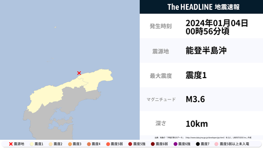1月4日0時36分頃、石川県で最大震度4の地震を観測