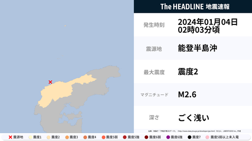 1月4日2時3分頃、石川県で最大震度2の地震を観測
