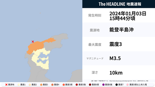 1月3日15時44分頃、石川県で最大震度3の地震を観測