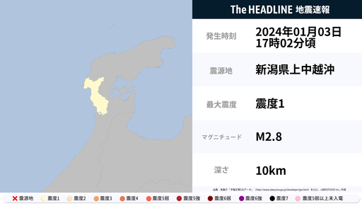 1月3日17時15分頃、新潟県・石川県で最大震度1の地震を観測