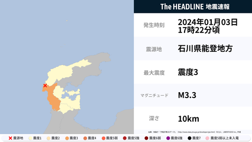 1月3日17時22分頃、石川県で最大震度3の地震を観測