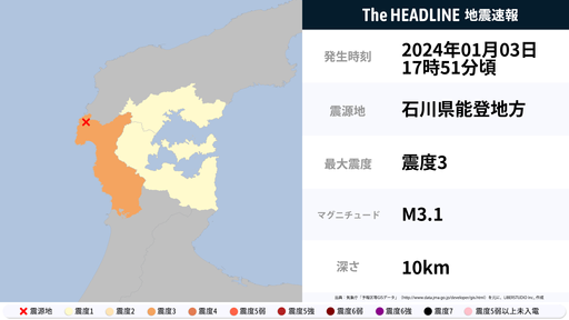 1月3日17時51分頃、石川県で最大震度3の地震を観測