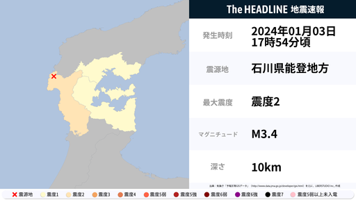 1月3日17時54分頃、石川県で最大震度2の地震を観測