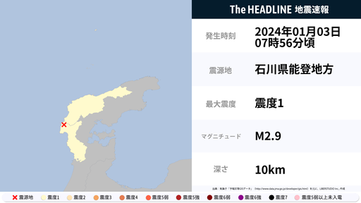 1月3日7時57分頃、石川県で最大震度1の地震を観測