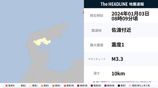 1月3日8時34分頃、石川県で最大震度3の地震を観測