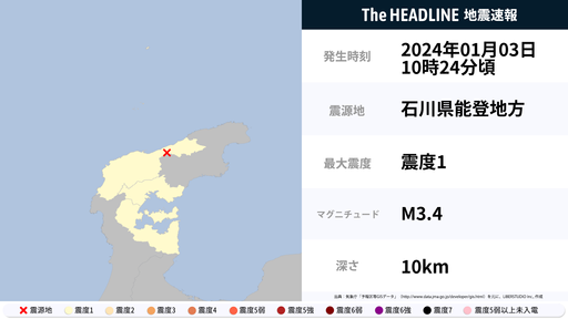 1月3日10時24分頃、石川県で最大震度1の地震を観測
