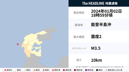 1月2日18時59分頃、石川県で最大震度2の地震を観測