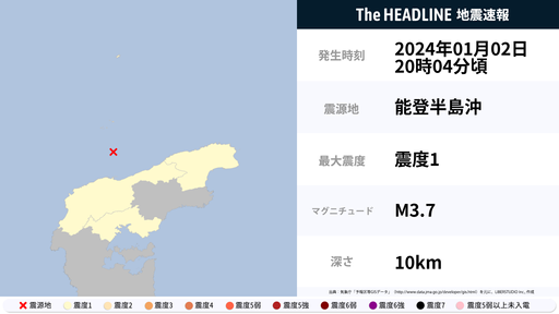1月2日20時30分頃、石川県で最大震度1の地震を観測