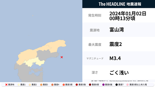 1月2日0時13分頃、石川県で最大震度2の地震を観測