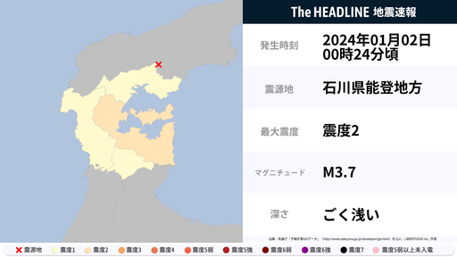 1月2日0時24分頃、石川県で最大震度2の地震を観測